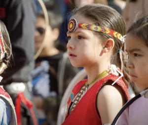 Valentino immediately began sharing the teachings of Nakotah and Steve, offering gratitude and blessings for the well-being of others whenever he could—at family gatherings, at school, in the park, for relatives, whether they were sick or well. During one of the group’s fundraising dances, Deborah Abeita Torrez inquired about the identity of the littlest dancer of the group and his parents told her “that’s our son!” Through Deborah, Valentino was offered the amazing opportunity to dance at Pearl Harbor for the Homecoming of the USS Santa Fe. Valentino performed with his fellow dancers around New Mexico, in San Diego for National Indian Gaming Association and in Phoenix at the World Hoop Dance Competition.